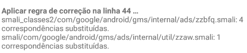 Neste exemplo encontramos uma regra que foi aplicada, pertencente a linha "44" que é a regra "44" e abaixo encontramos a seguinte mensagem "4 correspondência substituídas" isso significa que 4 componentes dentro do arquivo foi substituído!